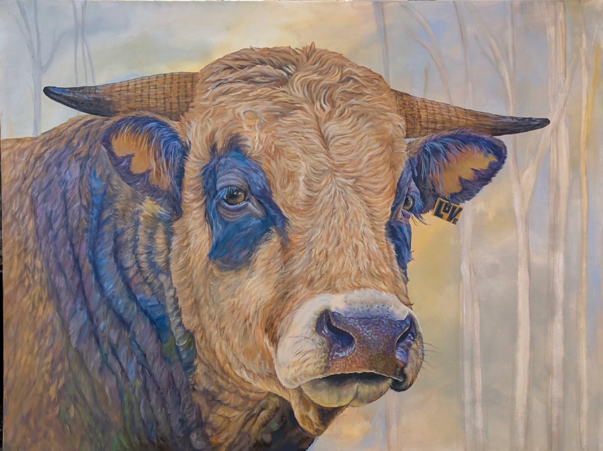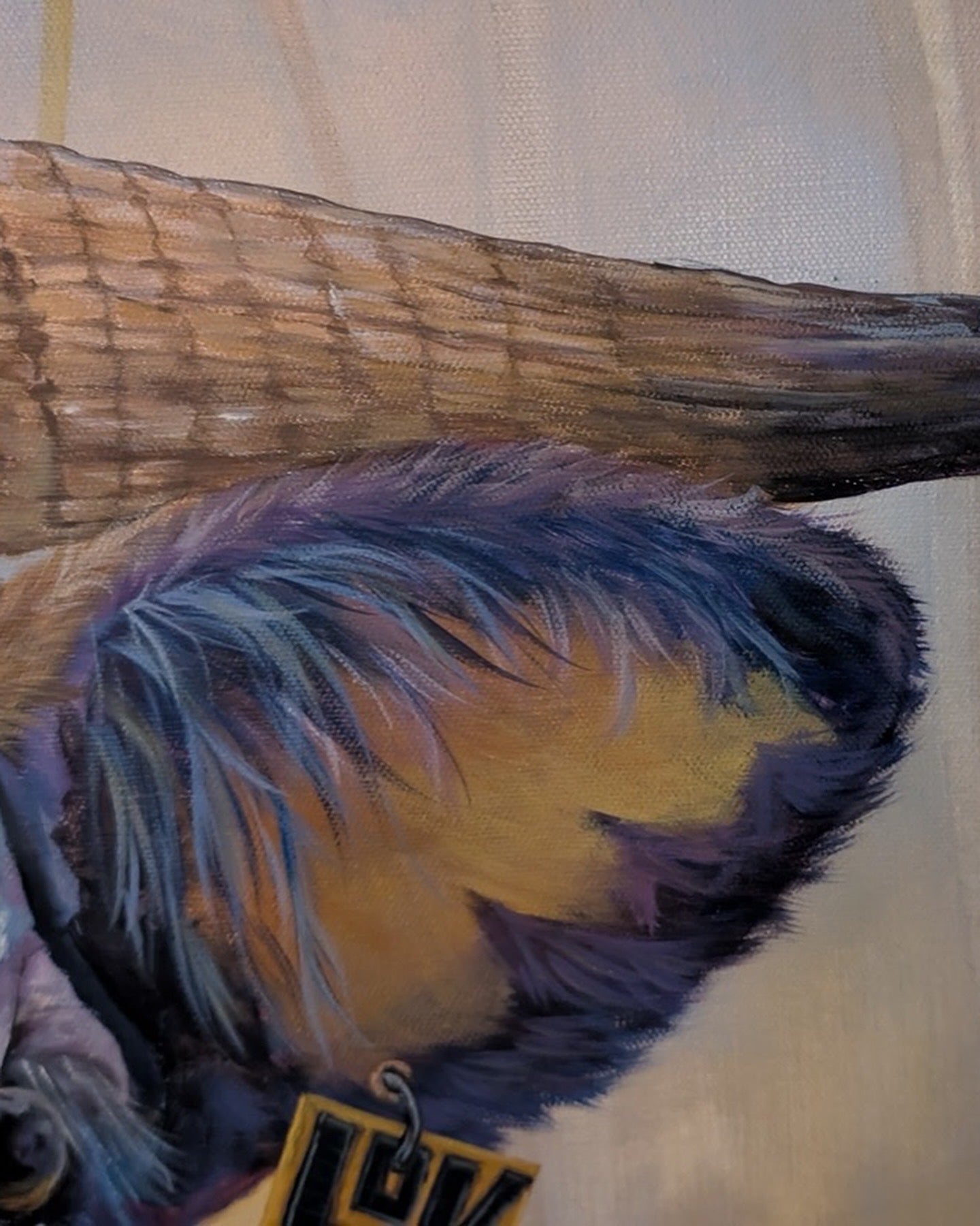 "Discover the allure of this one-of-a-kind art piece, measuring a striking 36"x48" (unframed). Crafted with rich acrylics and water mixable oils, it showcases a stunning palette of vibrant blues, warm oranges, and lush greens. The serene background of muted yellows and blues creates a tranquil setting, beautifully highlighting this magnificent creature. Bring this captivating work into your space and let it inspire your days!"