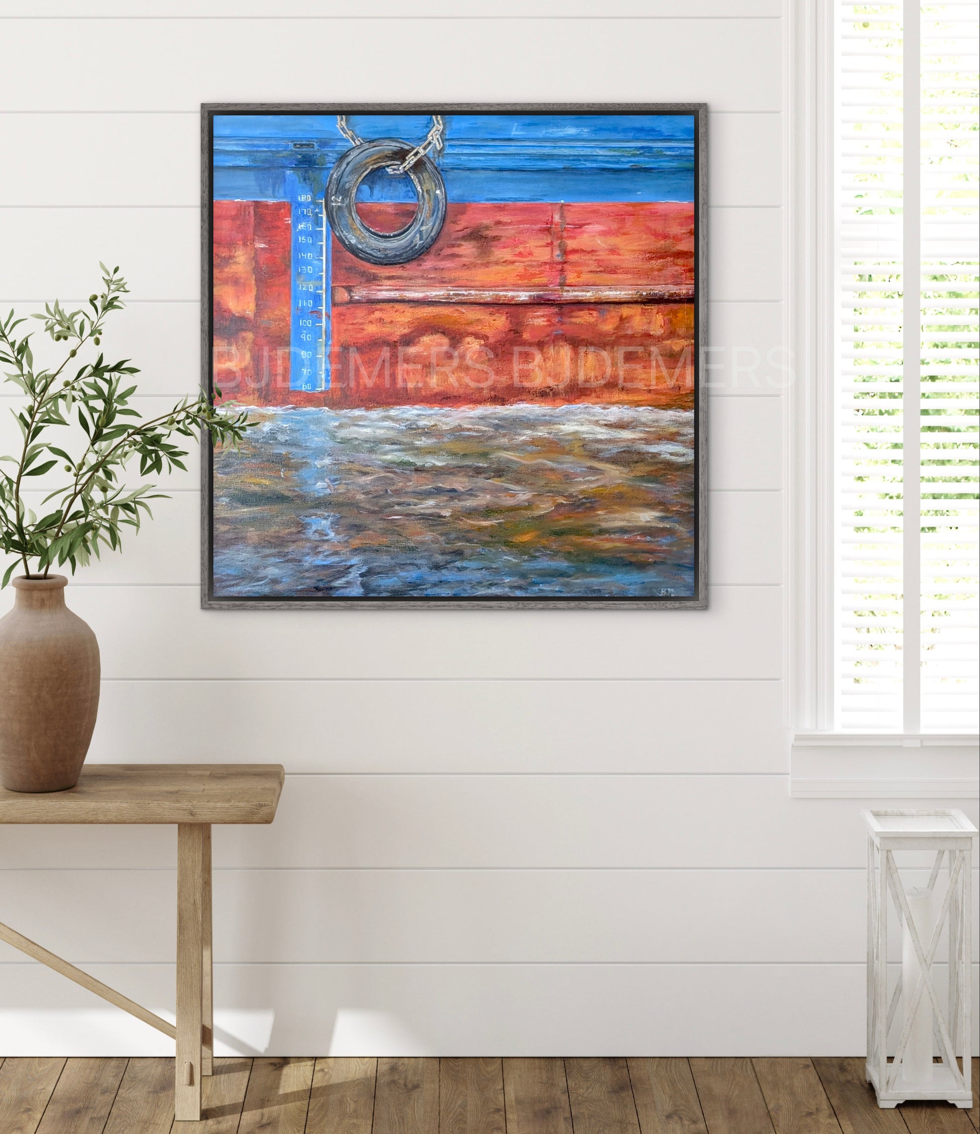 A vivid portrait of a weathered barge at sea, its rusted hull and peeling paint telling the story of years on open water. Bold textures, rich color, and churning waves capture the raw, rugged beauty of a vessel shaped by time and tide.
